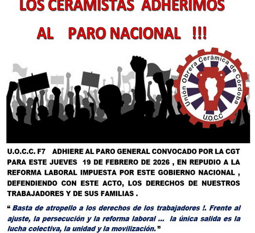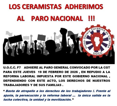 18 febrero, 2026U.O.C.C. F7 ADHIERE AL PARO GENERAL CONVOCADO POR LA CGT PARA ESTE JUEVES 19 DE FEBRERO DE 2026 , EN REPUDIO A LA REFORMA LABORAL IMPUESTA POR ESTE GOBIERNO NACIONAL , DEFENDIENDO CON ESTE ACTO, LOS DERECHOS DE NUESTROS TRABAJADORES Y DE SUS FAMILIAS .